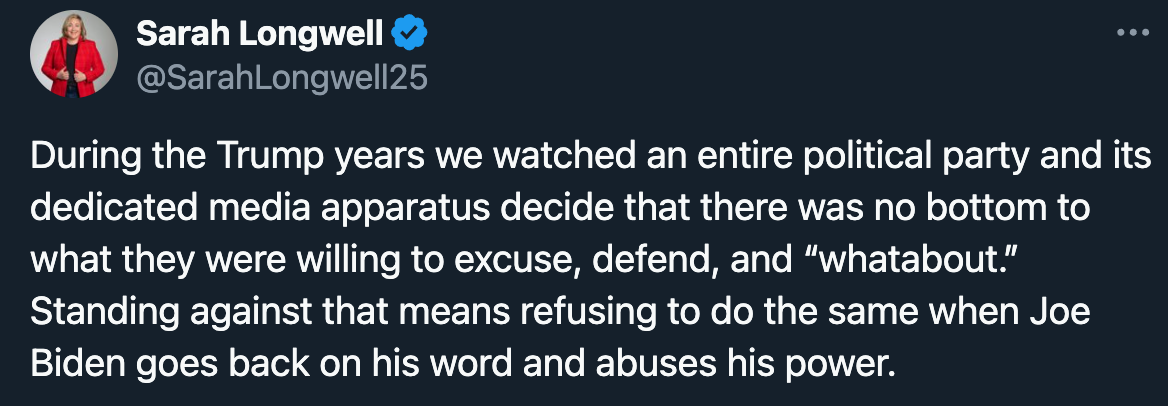 The high-road, moral superiority argument is equally bankrupt. Take Sarah Longwell’s assertion that Democrats no longer have a moral leg to stand on because Biden went “back on his word” and abused his power.