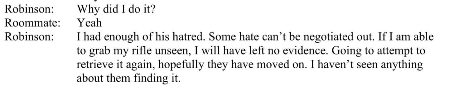 Much is still unknown about Robinson’s motives and views. I have tried not to speculate and to only report objective facts. I apologize for any errors that might be revealed by new information as the case moves forward over the next year or two.