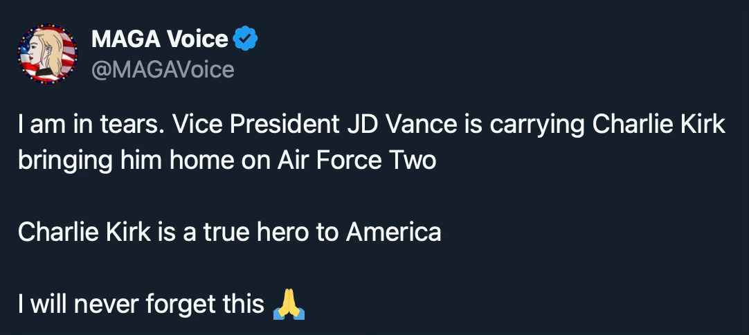 The Air Force 2 stunt was dutifully captured in widely shared videos that hard-right MAGAs on X hailed as proof of Kirk's supposed heroism. Vance even skipped a 9/11 New York memorial to visit Kirk's family, which perfectly sums up MAGA’s values and priorities.