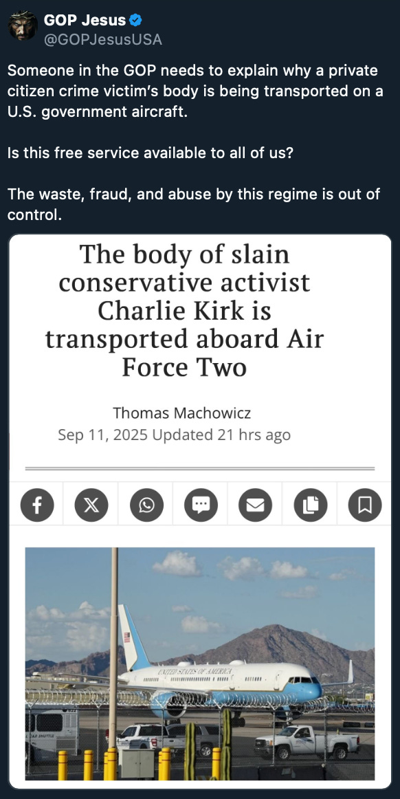 Ask yourself, why did Trump use taxpayer dollars to pay for the cost of flying Kirk’s body home on Air Force 2?