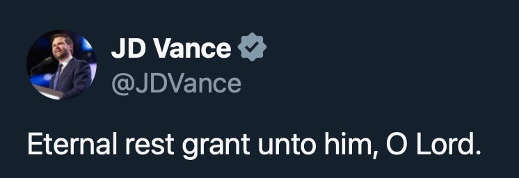 On September 11, Vance posted a prayer on X: "Eternal rest grant unto him, O Lord," and praised Kirk's supposed commitment to "open conversation with allies and critics alike" in a polarized era. Vance forgot to mention that he and Kirk were two of the primary instigators of that polarization.