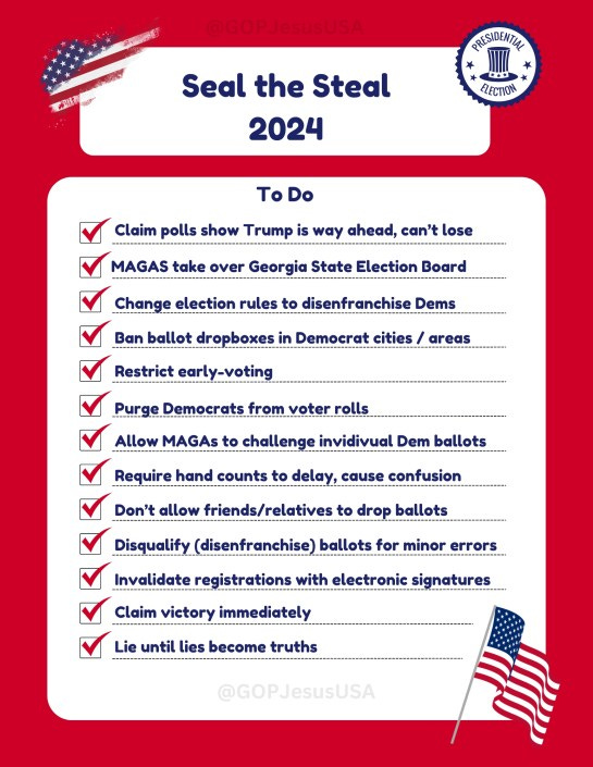 President Trump and his MAGA surrogates (influencers, MAGA politicians, billionaire backers like Musk) preemptively claim that the Democrats are the ones who are planning to steal the election. There's a saying on Twitter that "every Republican accusation is an admission," which definitely applies here.