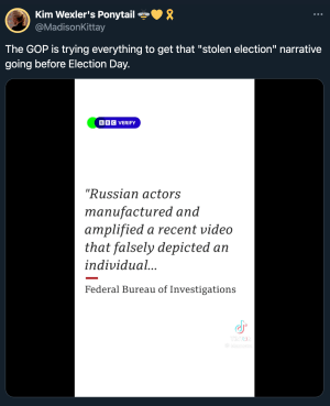President Trump encourages his supporters (and Russia) to lie and fabricate problems to further this narrative. Watch Bucks County again. The FBI says there is a fake video of a supposed election worker opening up and destroying votes for Trump. The video is easily debunked but that's not the point. Getting the story out there informs the uninformed MAGA followers and reinforces their belief that the evil Democrats are trying to steal the election from President Trump who has already won it.
