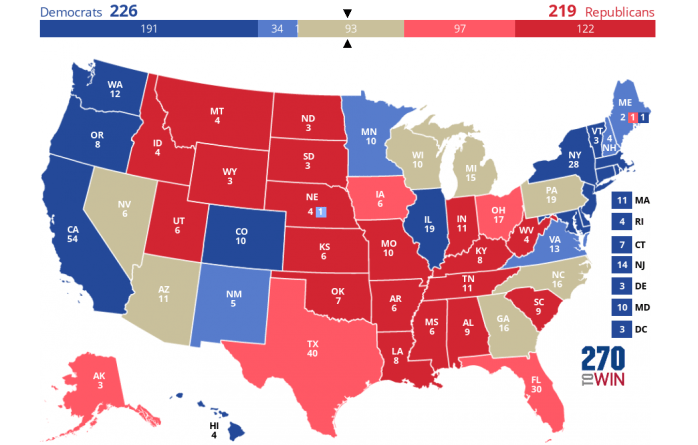 Swing states are NV, AZ, WI, MI, PA, NC, and GA accounting for 93 Electoral College votes.
