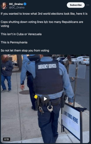 Despite the routine actual facts, influencers like @DC_Draino on X did a fantastic job spewing faux outrage to his 1.8 million followers that "this is what 3rd world elections look like," while claiming that the "cops" were shutting down the lines because "too many Republicans are voting."